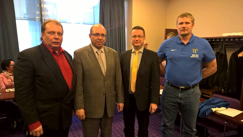 Vuoden 2015 turnaus startattiin käyntiin jo perjantaina päivällä kun joukkueiden, järjestäjien ja yhteistyökumppaneiden edustajat kokoontuivat Hotelli Cumulukseen hengennostatustilaisuuteen. Tilaisuuden arvovaltaisiin vieraisiin kuuluivat mm. Palestiinan Suurlähettiläs Taissir Al Adjouri (toinen vasemmalta), kansanedustaja Mika Kari (toinen oikealta) ja olympiamitalisti, Tallinn Kalevin toiminnanjohtaja Alexander Tammert (oikealla). Kuvassa vasemmalla Ay-jalkapallo ry:n puheenjohtaja Heikki Moilanen.